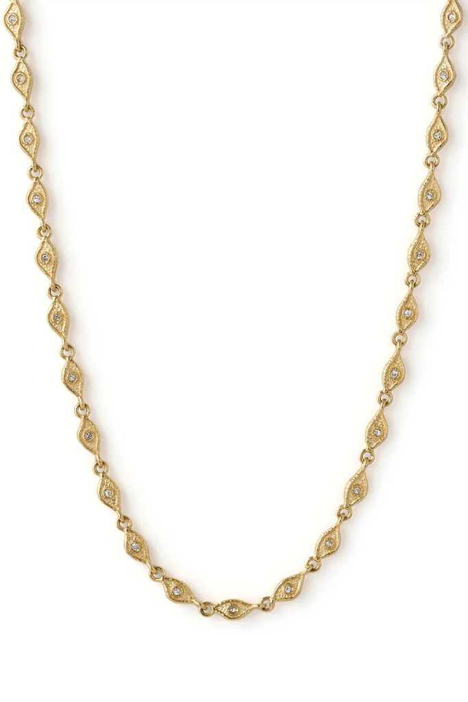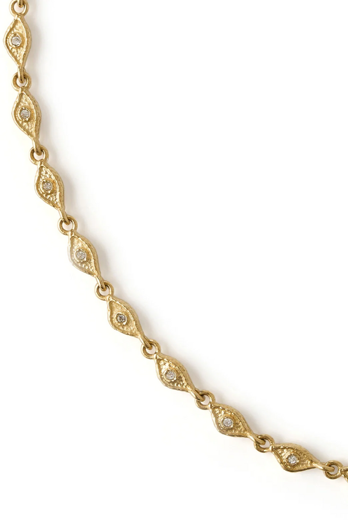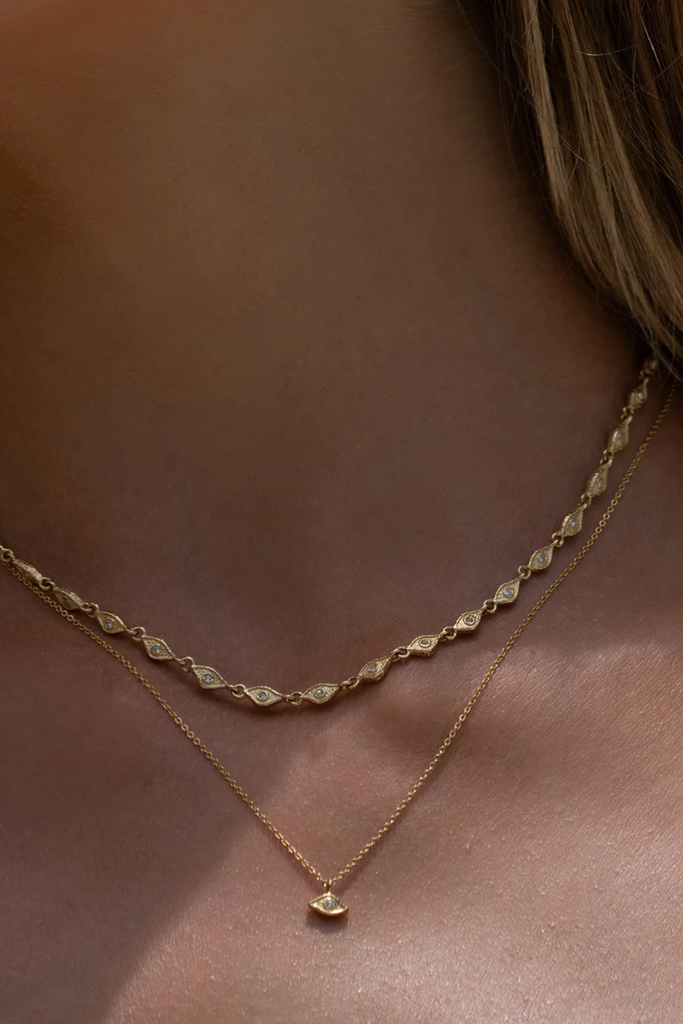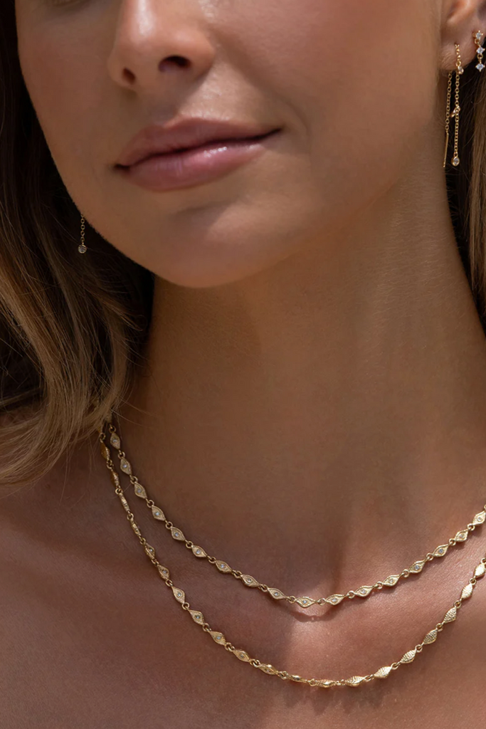 Escape to paradise everyday when you're wearing our enchanting Elysian Necklace, a truly stunning piece sure to be the star of your look! This beautifully textured chain features an array of shimmering evil eyes to make sure you attract good energy only. Pair this necklace with it's matching Elysian Bracelet to make the perfect gift of protection for a special someone.