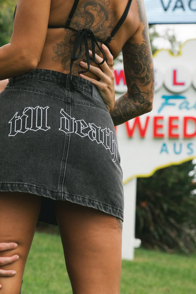 BILLY BONES CLUB BILLY BONES CLUB - TILL DEATH DEATH DENIM SKIRT - ACID BLACK $89.95 XS Low Inventory S Out of stock M Low Inventory L Out of stock XL Low Inventory