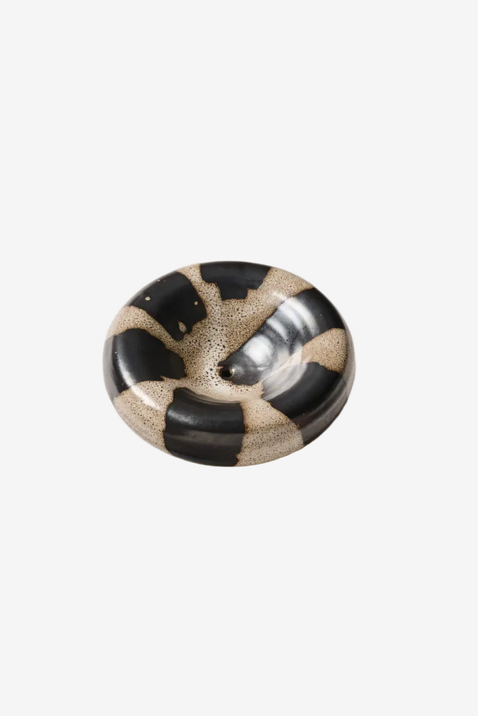 Inspired by calm, this rounded ceramic incense holder brings a meditative touch to your daily rituals with its smooth, circular form and gentle ridged surface. Finished in a texture chocolate and white colourway, it pairs beautifully with any interior style, from modern minimal to earthy organic. The central opening holds standard incense sticks upright, allowing ash to catch neatly into its wide basin. Material: Hand-formed ceramic with chocolate and white stripe Dimensions: 10 cm (W) x 4.5 cm (H) - our largest incense holder. Fits: Our This is Incense 2.1mm and new Second Wave 3mm incense sticks Care: Wipe clean between with a damp cloth A grounding addition to your space—designed to elevate the everyday.