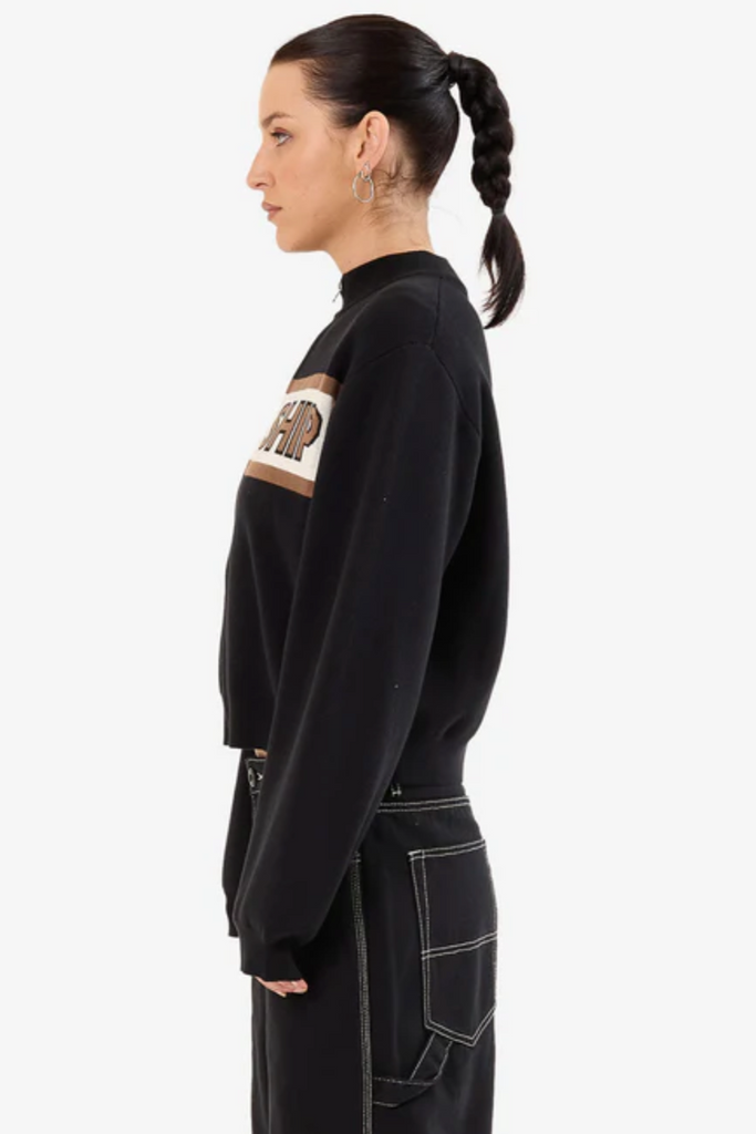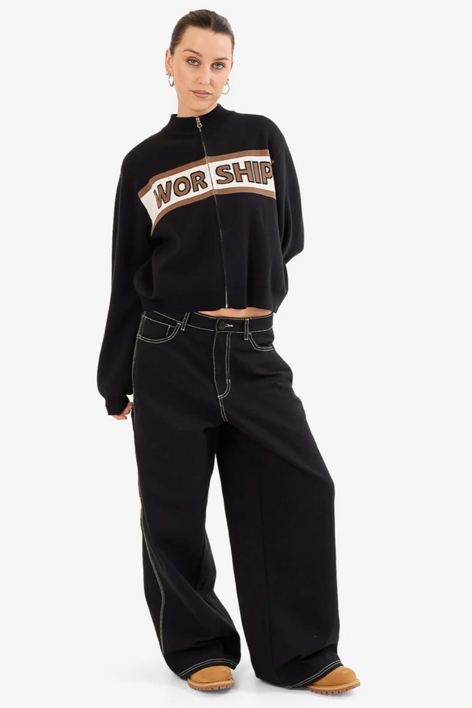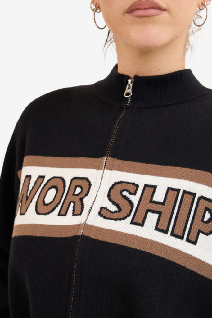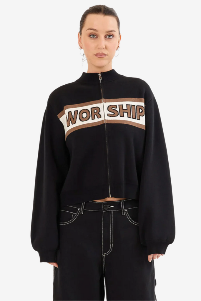/ WORSHIP SUPPLIES BRASSY ZIP FRONT KNIT JACKET - BLACK