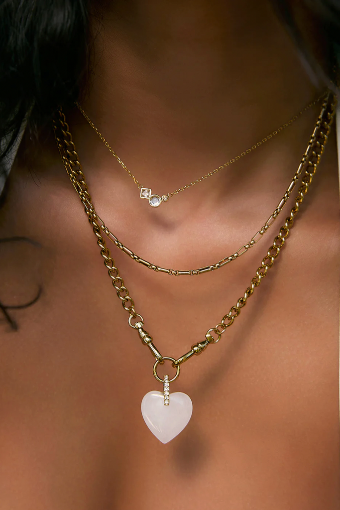 Romantic and refined, the Violet Heart Necklace is a statement style here to add a golden touch of beauty to your look. A rose quartz heart is complemented with sparkling stones, sure to turn heads and capture hearts wherever you go!