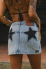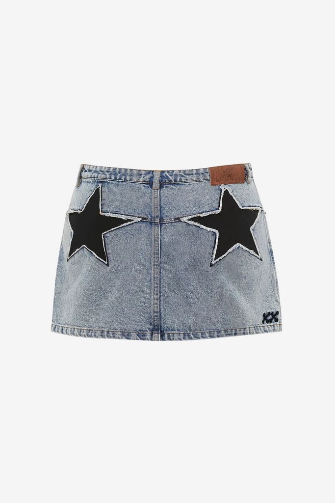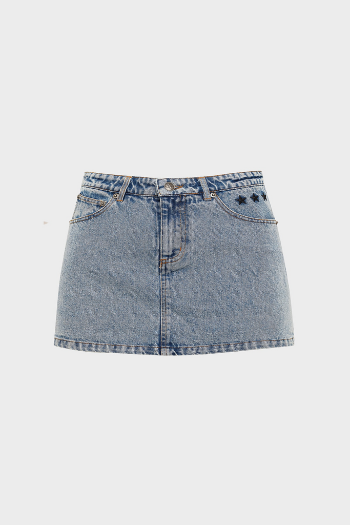 The Star Studded Skirt, available in a washed blue denim. Featuring two embroidered stars smack bang on the back!