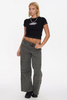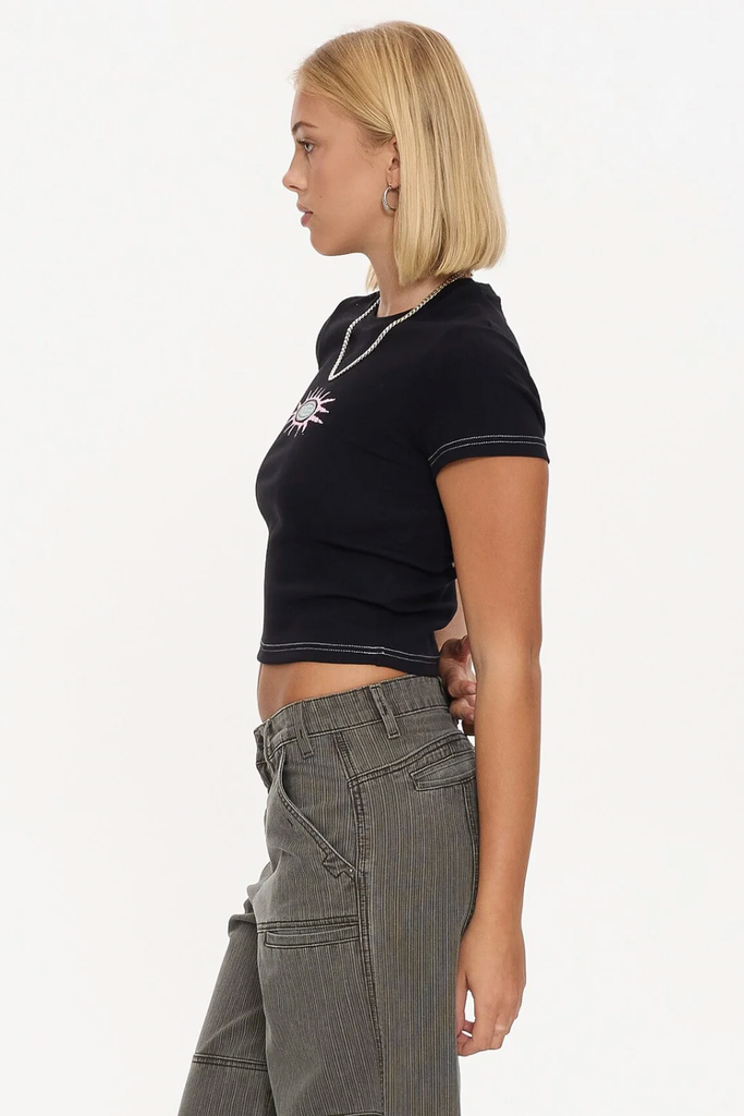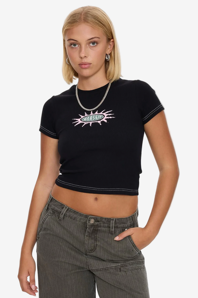 Slim, sharp and loaded with attitude, the Logo Fever Slim Fit Tee in Black is built from a soft, stretchy blend of cotton and elastane for a snug, body-hugging fit. The cropped cut and stretch rib fabric features Y2K inspiration, while the bold graphic across the chest elevates the streetwear energy. Perfect for edgy summer fits or casual day looks, this cropped tee women's au piece pairs effortlessly with anything, from micro skirts to low-rise denim or baggy cargos.