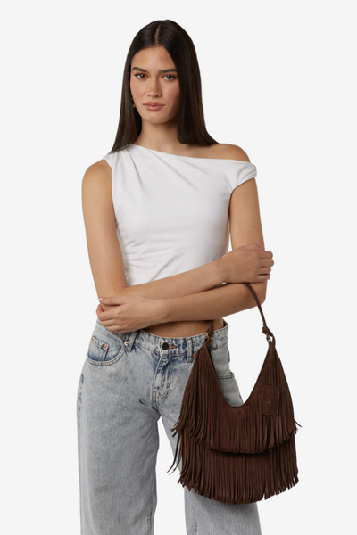 PETA + JAIN PHOEBE SMALL FRINGE BAG - CHOCOLATE SUEDE/GOLD