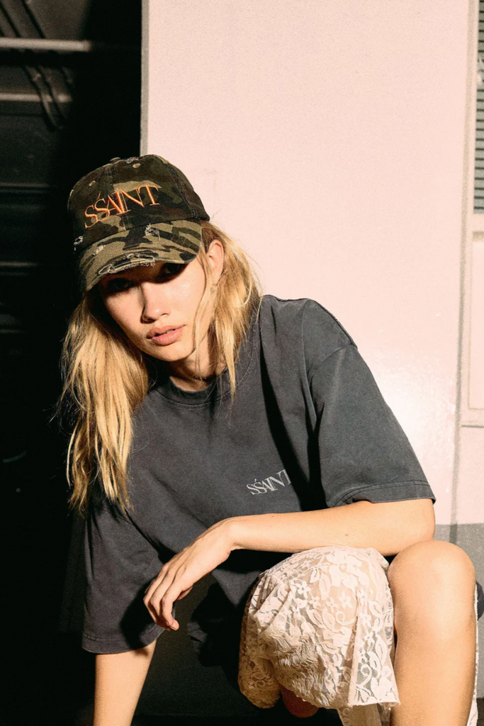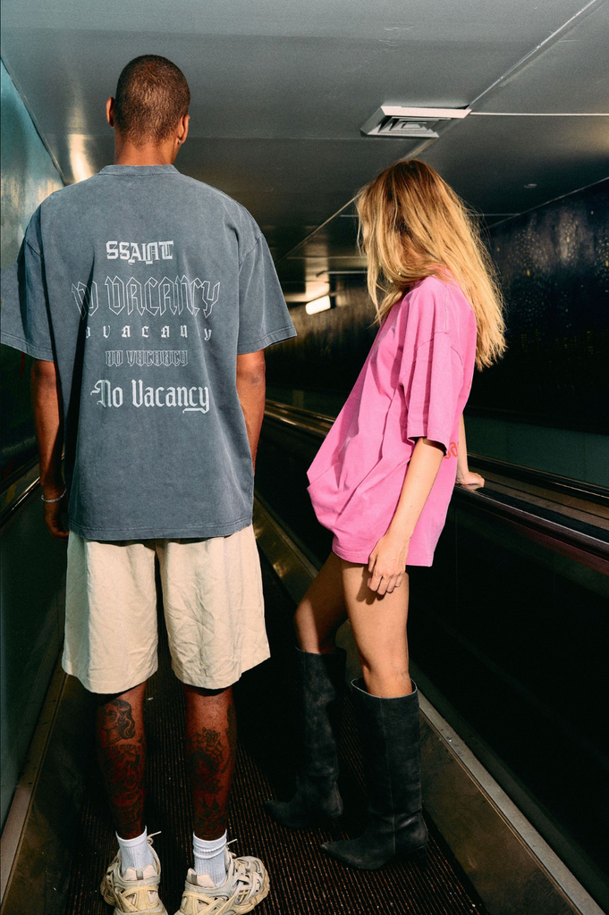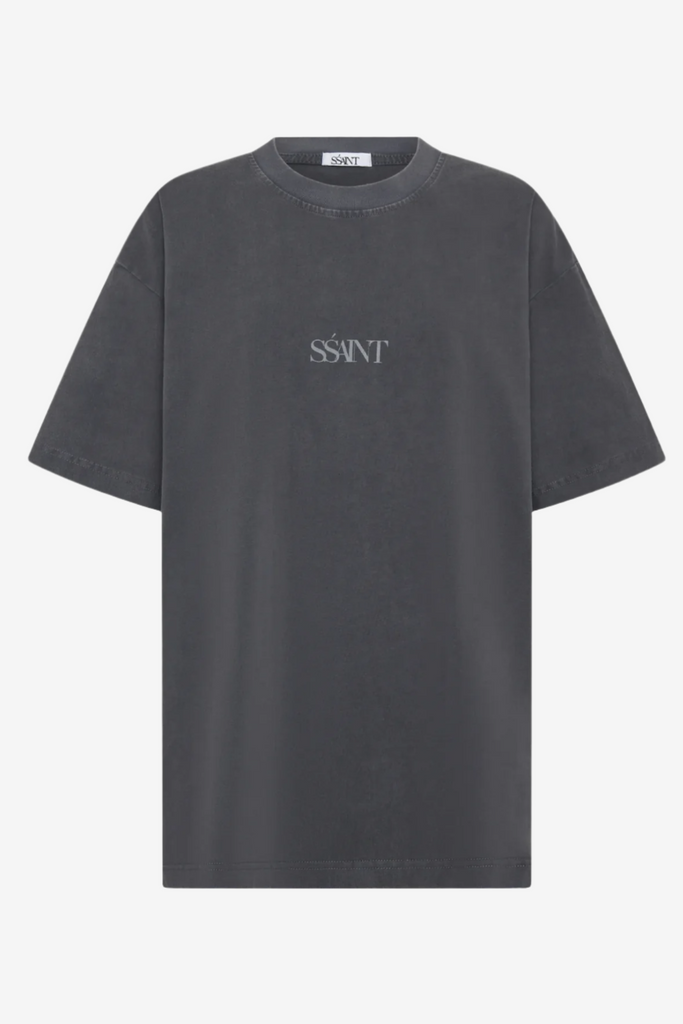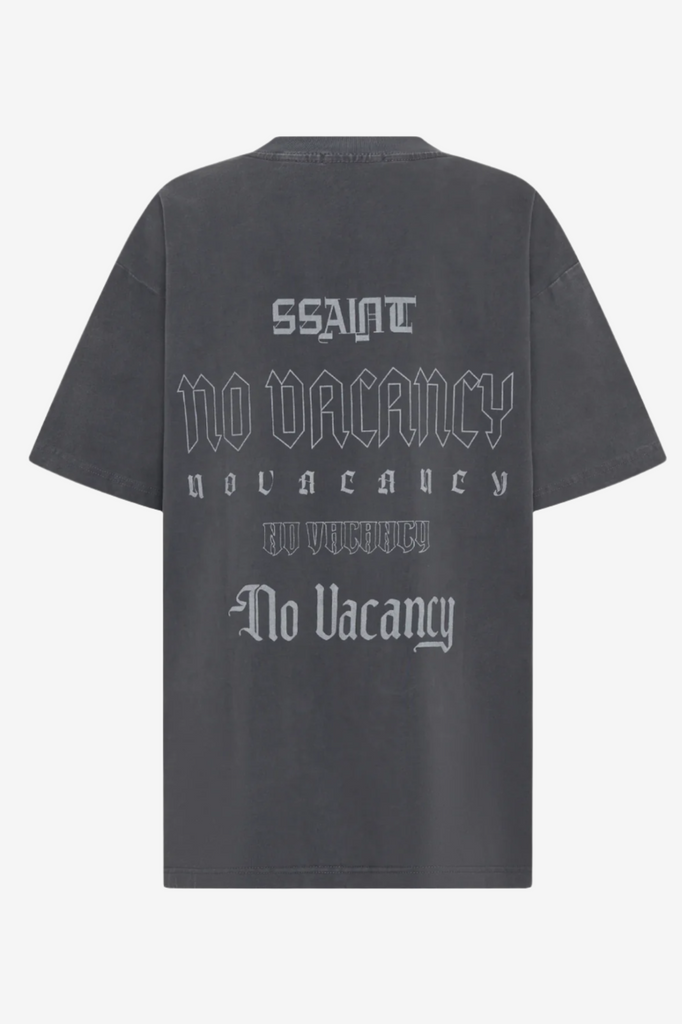 Introducing the No Vacancy Tee in Charcoal Acid Wash. This unisex design features a bold red SŚAINT logo on the front and a compilation of No Vacancy prints on the back. Inspired by our iconic No Vacancy fragrance - a scent made to turn heads and spark compliments, this tee exudes main character energy. Bold, stylish, and impossible to ignore.