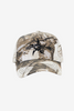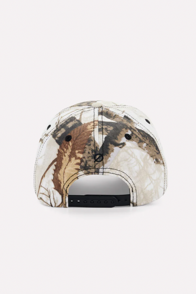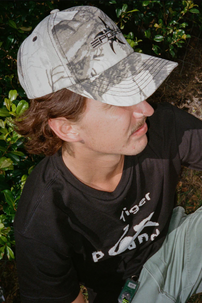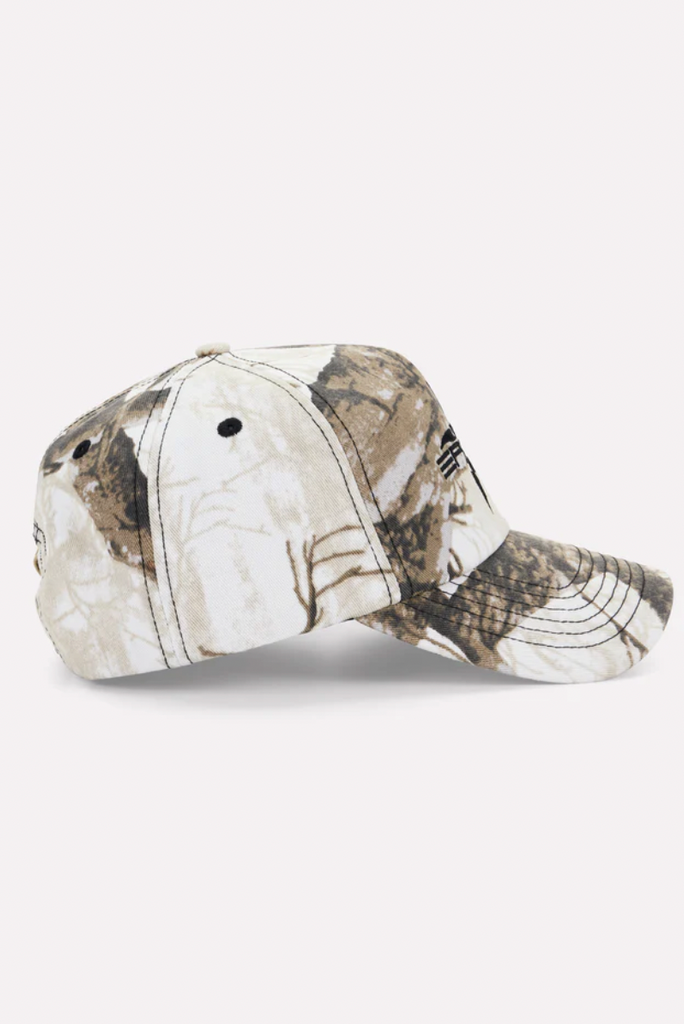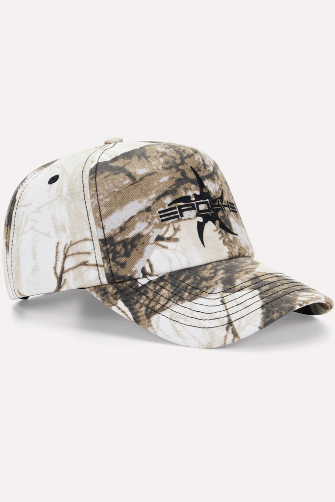 The Epokhe Weapon Cap in Snow Camo features bold Epokhe embroidery layered over a custom camo print. Designed with a contrast black stitch and adjustable snapback closure.