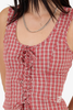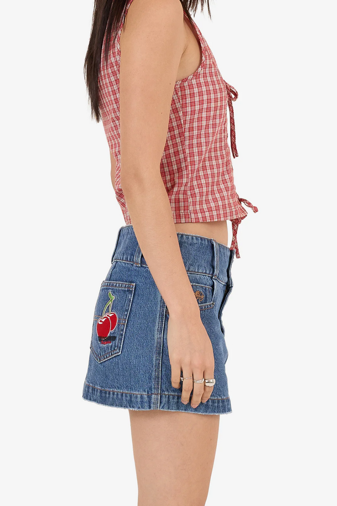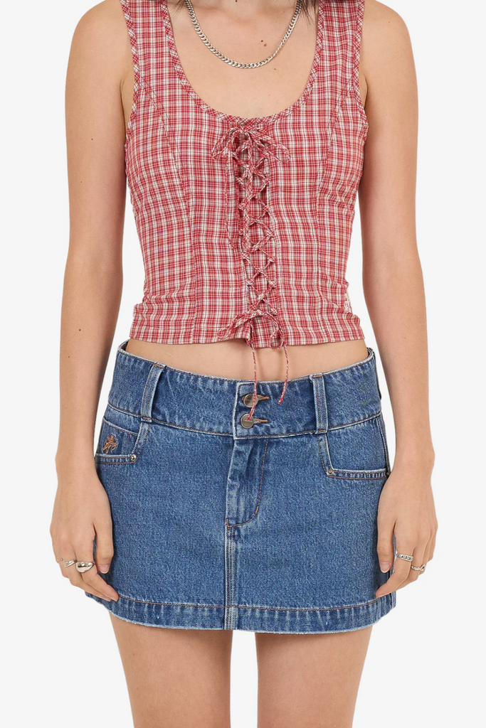 The Impish Lace Up Top in Cherry Red hits that sweet spot between flirty and street-ready. With a cropped fit, lace-up front, sleeveless cut, and all-over yarn dye check pattern, this Worship Supplies spring staple delivers attitude and late-90s edge built in. The cotton-poly blend keeps it lightweight but structured, perfect with a micro skirt or low-rise cargos for an easygoing, effortless finish.
