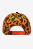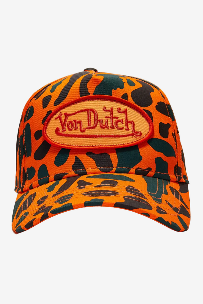 The Paris Camouflage Snapback Trucker Hat by Von Dutch features an iconic logo patch, an orange camouflage design on the front, and an adjustable snapback panel. All headwear sales are final.