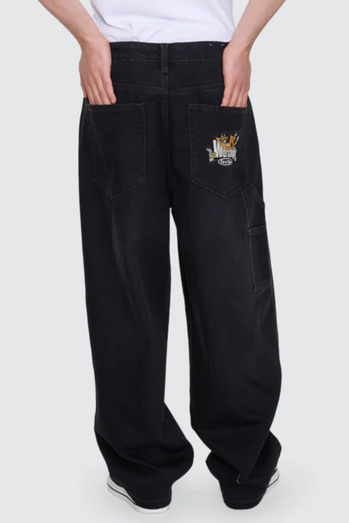Baggy jean, internal drawcord, back pocket embroidery, carpenter pockets