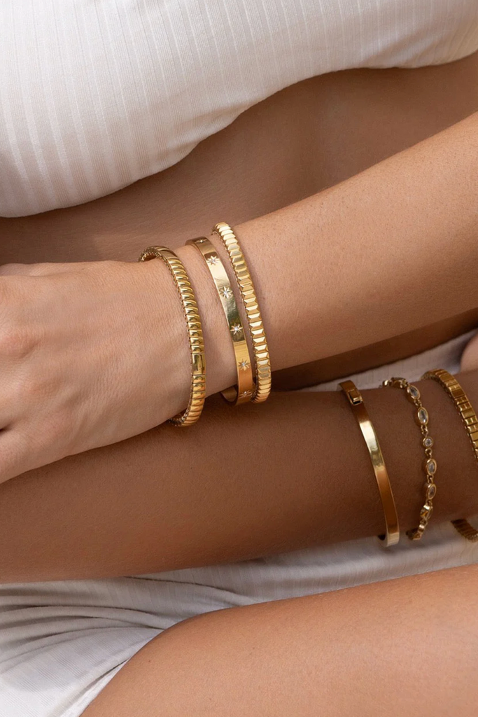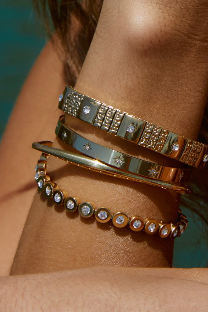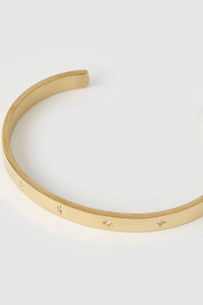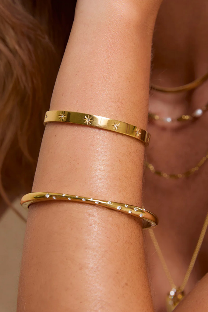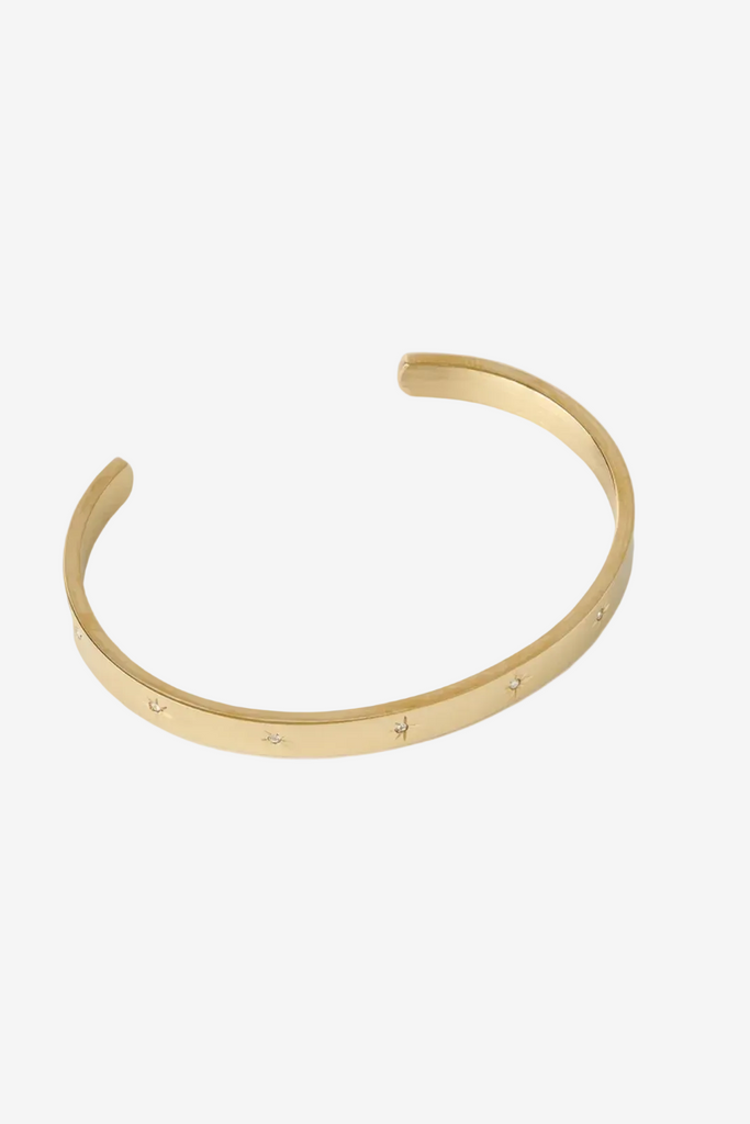 Elevate your look with the radiant Gemma Cuff. Adorned with sparkling star-studded stones, this glistening beauty catches the light from every angle, turning heads and adding celestial charm to any bracelet stack.