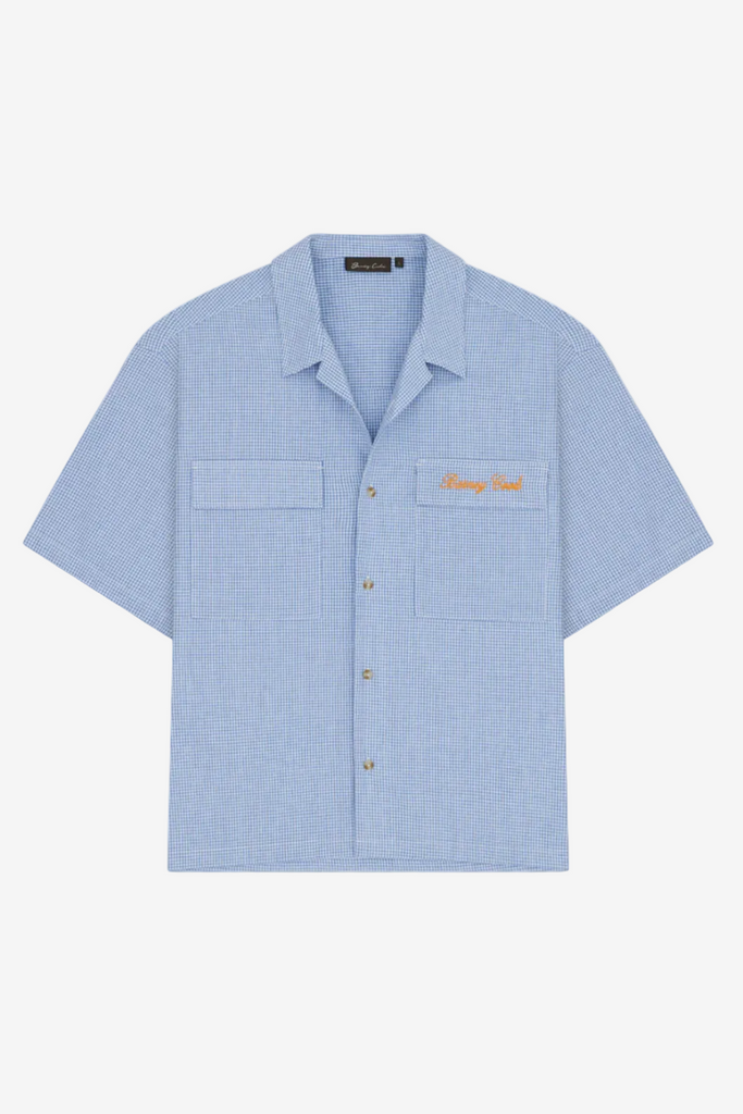 This boxy and cropped fit shirt is made on cotton oxford fabric, with woven gingham micro check. Chest pocket flap features raised embroidered logo. Shirt has resort collar and light tortoise buttons.