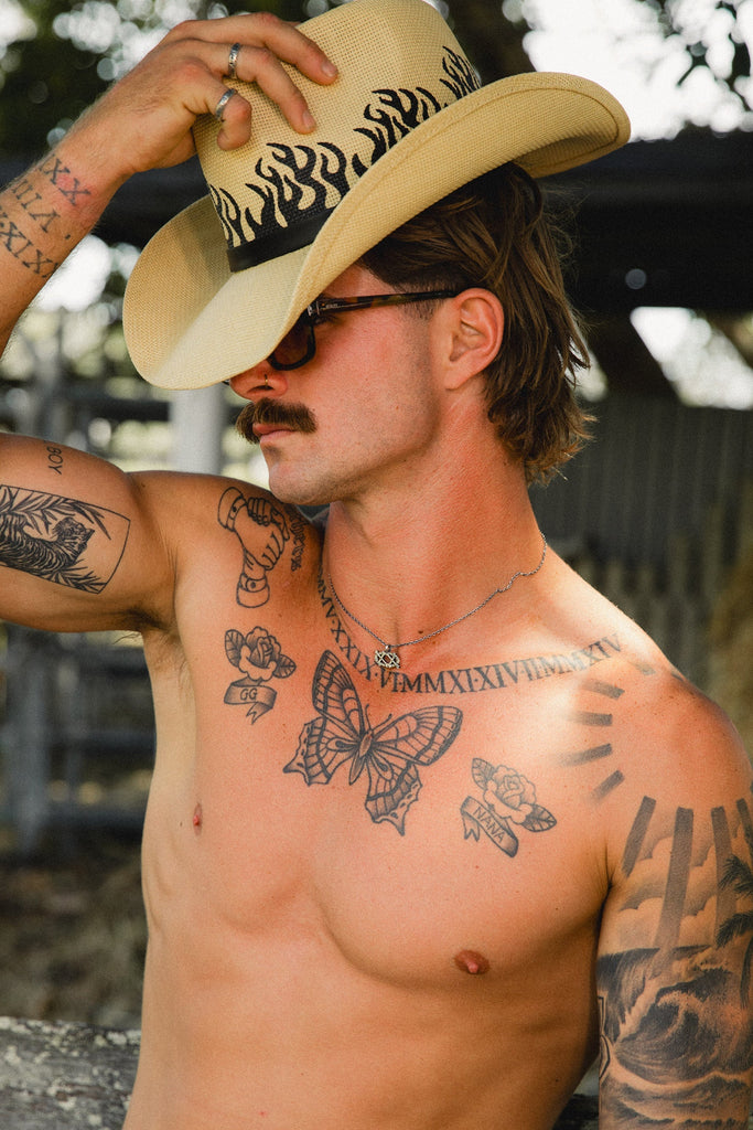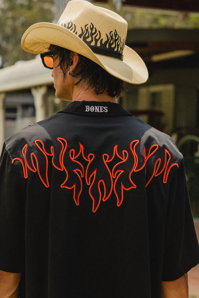 Taking it back old school with the new Straw Cowboy Hat! This ones a real easy wear, featuring printed flames on the outside finished off with a black strap.