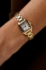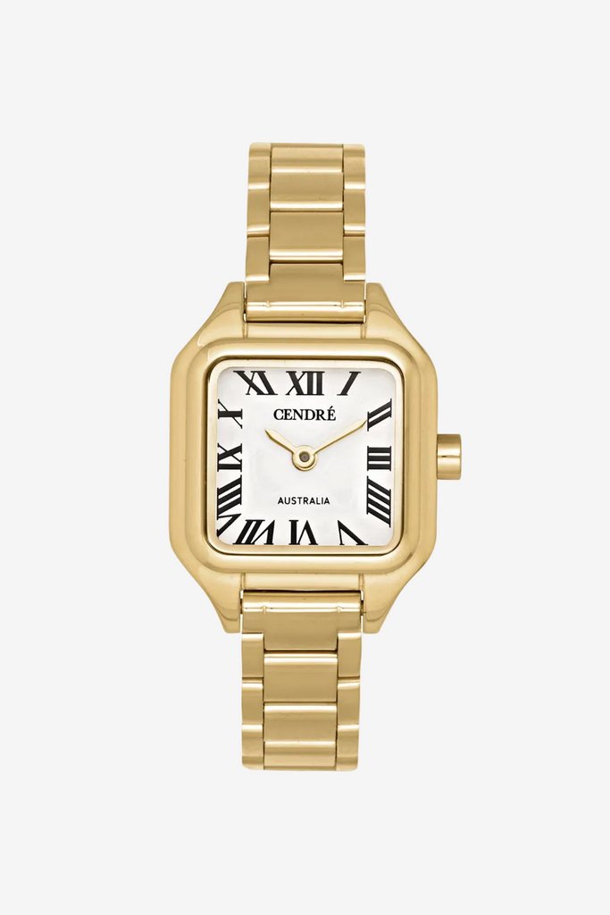 Crafted from 14k premium gold plated stainless steel, featuring a square face, roman numeral dial and an elegant jubilee-style band.