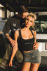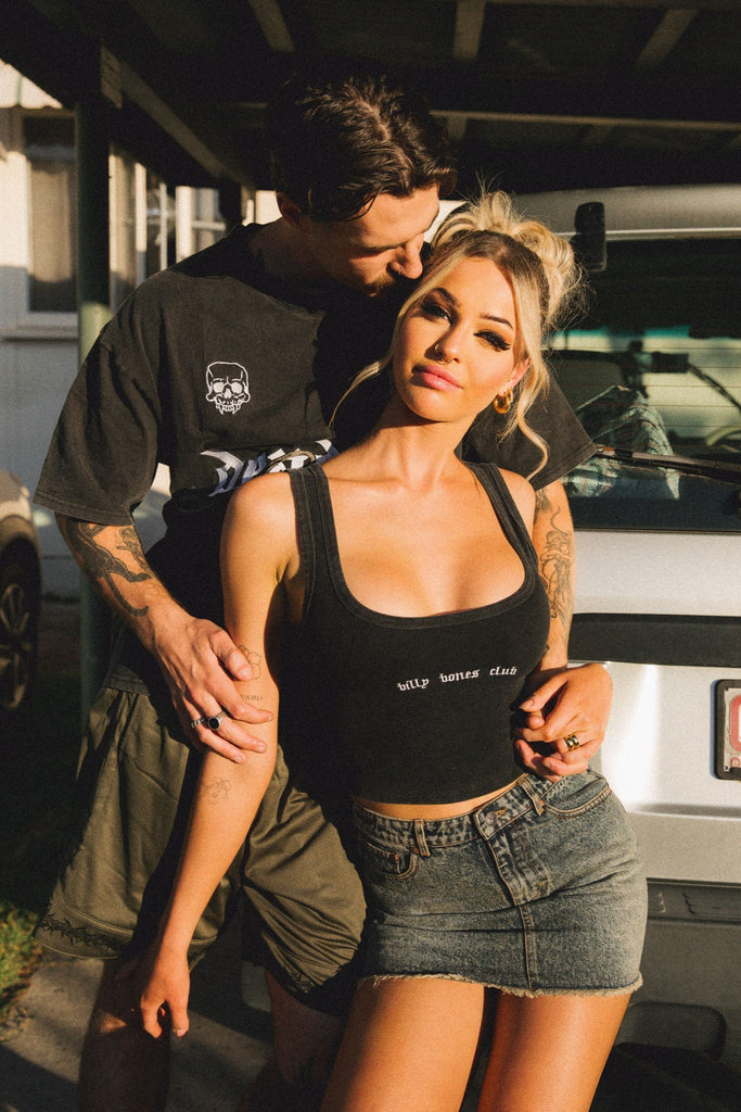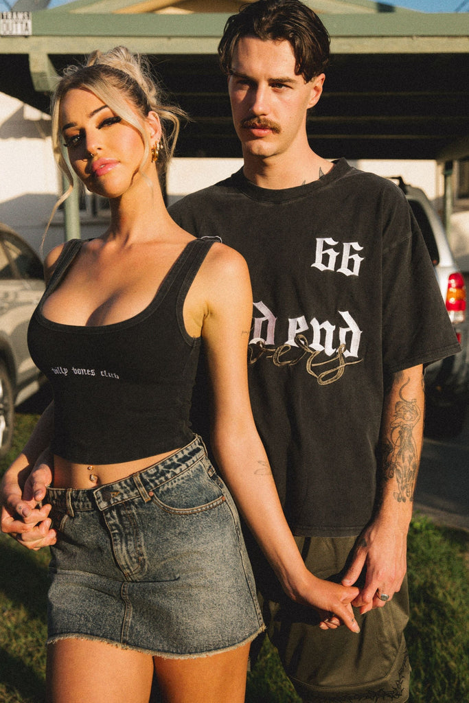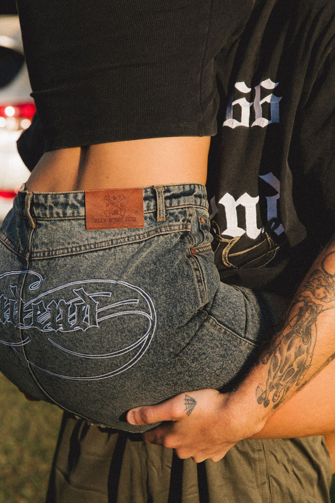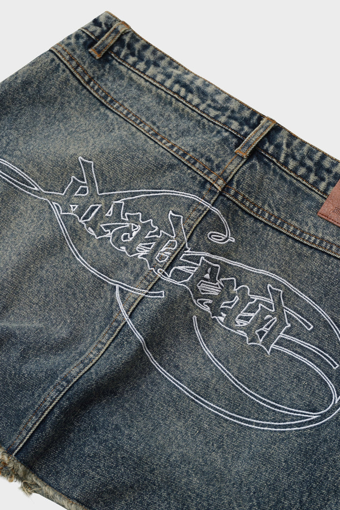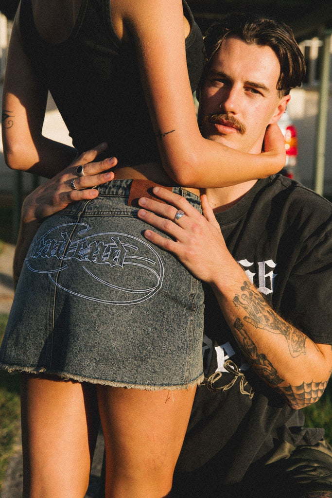 The Dead End Skirt, available in a washed denim. Featuring a frayed hem and embroidered Dead End Lovers graphic smack bang on the back!