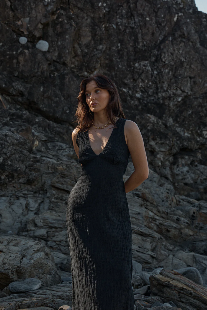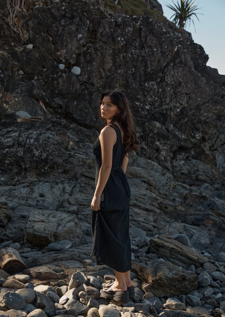 One of our best selling dresses are back in a new colour. Made from a hemp and tencel blend, this seersucker maxi dress is textured, comfy and perfect for when you want to slip into something easy. Featuring a removable waist tie, you can wear it alone or layer with a long sleeve top in winter to create the perfect year-round number.