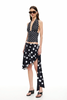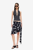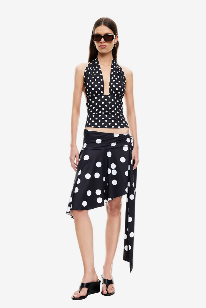 A POLKA DOT AFFAIR.Safari Midi Skirt Features:ITEM RUNS TRUE TO SIZELow riseTie up sideAsymmetric hemline80% POLYESTER 20% ELASTANEModel wears size S and is 179cm