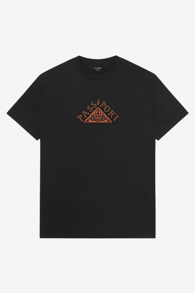 Pass~Port Manuscript t-shirt in black. The The Manuscript Pass~Port T-shirt is made from 100% cotton and features embroidered applique on front and is finished in the classic Pass~Port tee fit.
