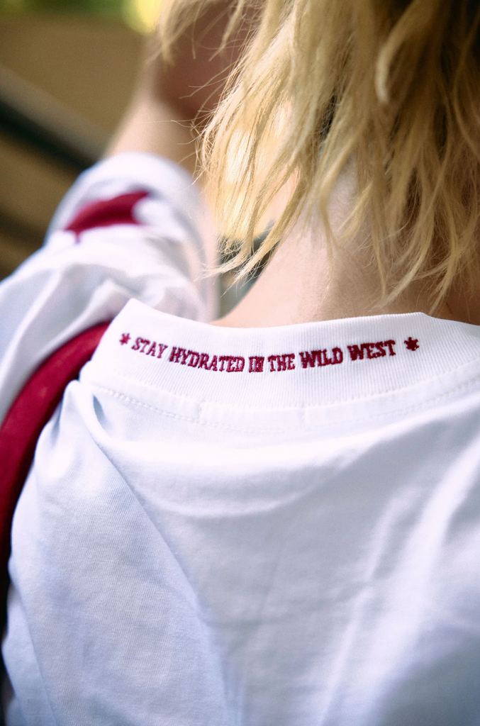Embrace the Wild West with the Cowboy Water Tee. Inspired by our bestselling fragrance, this unisex tee features a bold white and red Cowboy Water logo, stars on the sleeves, and the embroidered slogan "Keep Hydrated in the Wild West" stitched in vibrant red on the collar. Rugged, stylish, and effortlessly iconic.