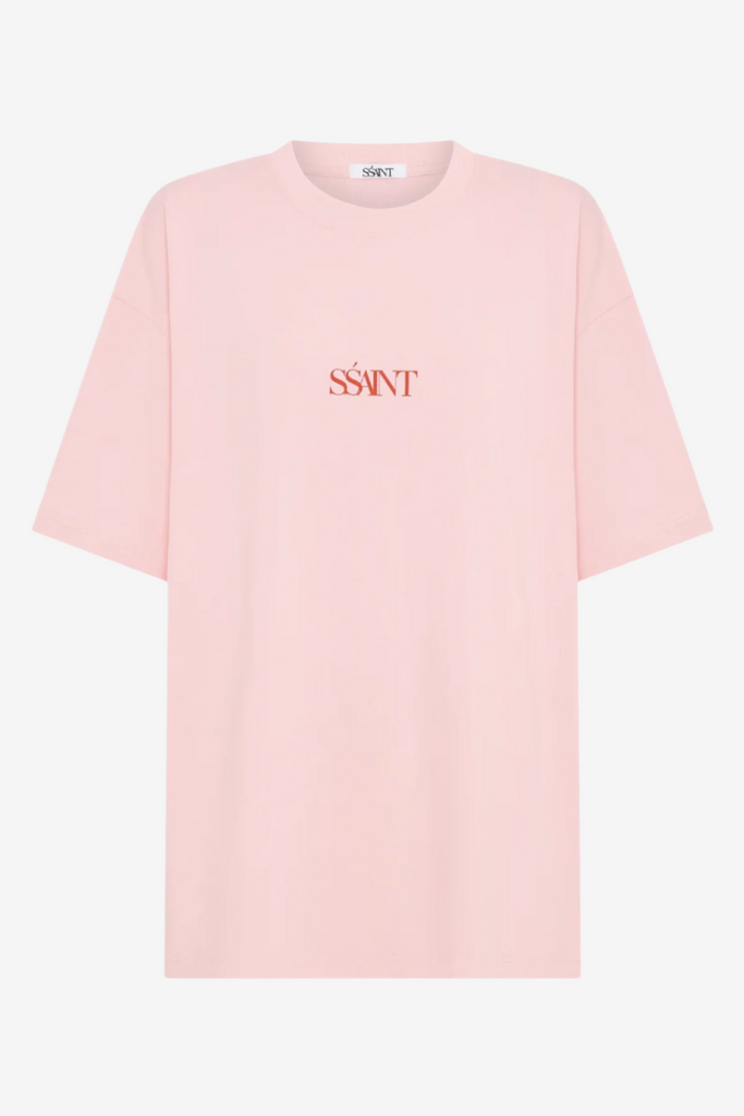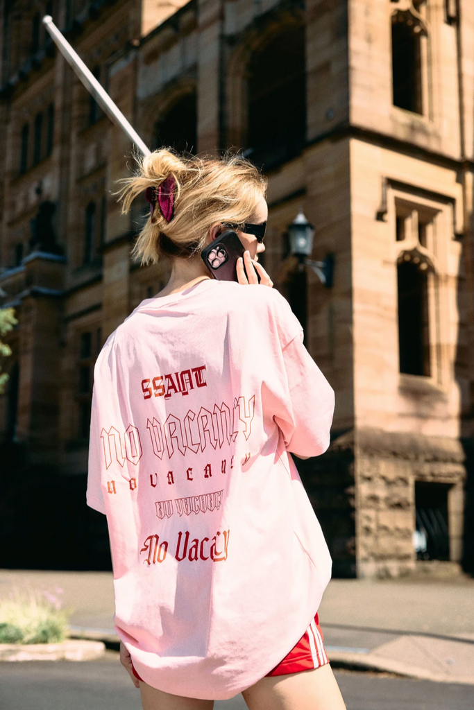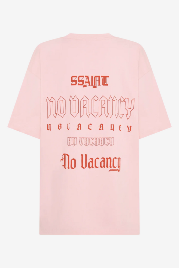 Introducing the No Vacancy Tee in pink. This unisex design features a bold red SŚAINT logo on the front and a compilation of No Vacancy prints on the back. Inspired by our iconic No Vacancy fragrance - a scent made to turn heads and spark compliments, this tee exudes main character energy. Bold, stylish, and impossible to ignore.