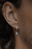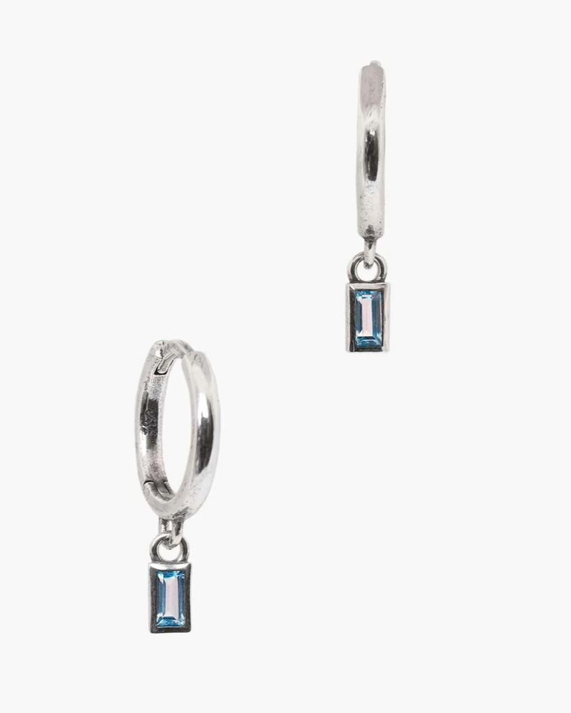 The Topaz Baguette Huggie Earring features a 4mm x 2mm light swiss blue topaz baguette gemstone charm on a 10mm huggie earring, cast in 925 sterling silver.