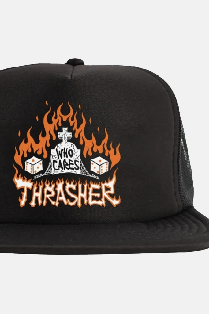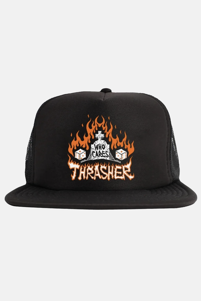 THRASHER MAGAZINE WHO CARES SNAPBACK TRUCKER CAP - BLACK