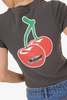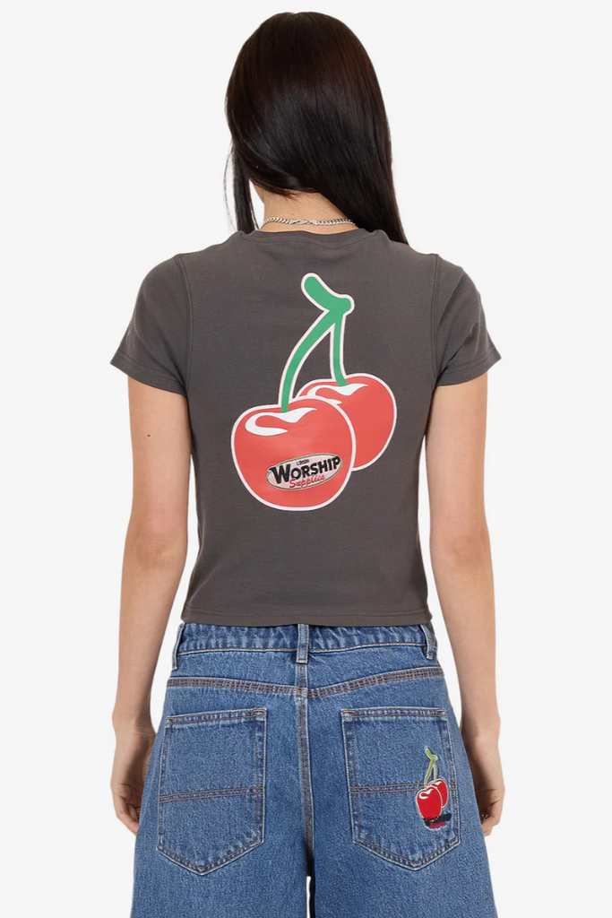 • The Glazed And Confused Slim Fit Tee in Worn Black brings a balance of chic style and street edge with its cherry chest graphics and clean, cropped silhouette. Made from soft yet structured fine rib cotton, this vintage women's tee hugs the right places without compromising comfort. The faded black wash gives it that lived-in, grunge-ready edge finish, perfect for pairing with low-rise denim jeans or baggy cargo shorts.