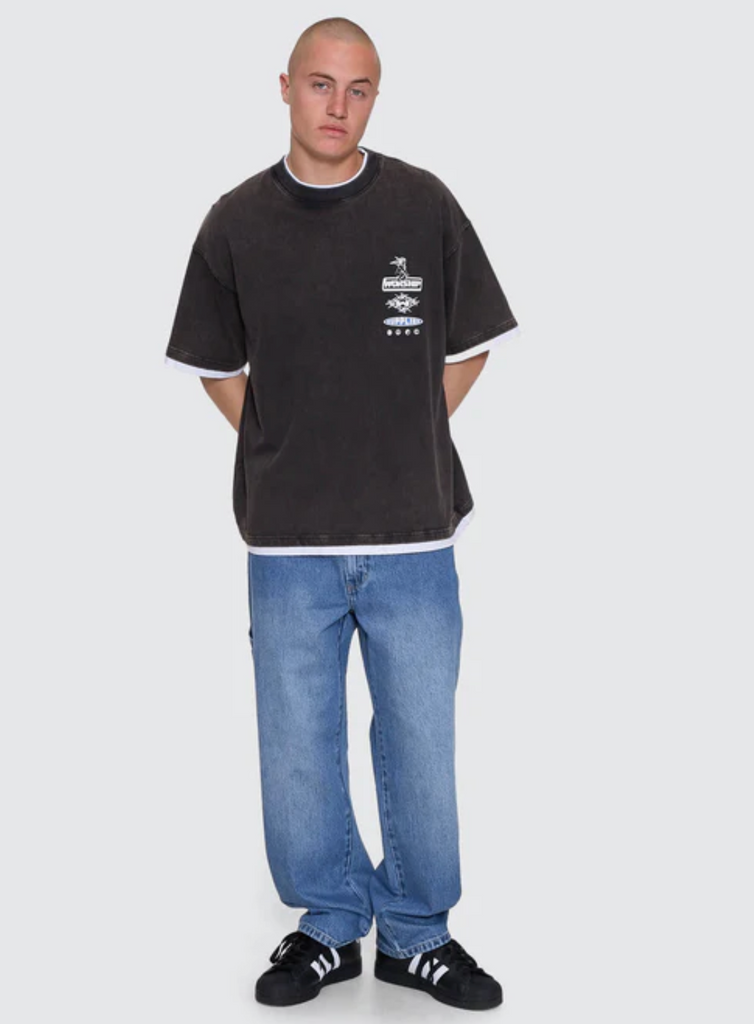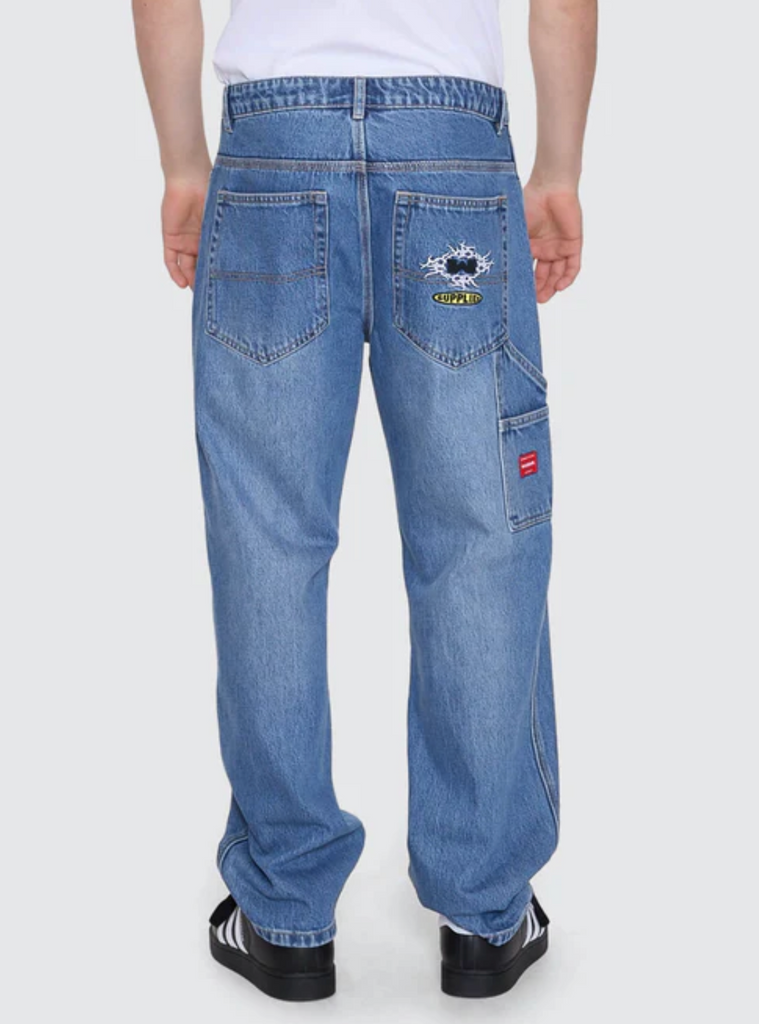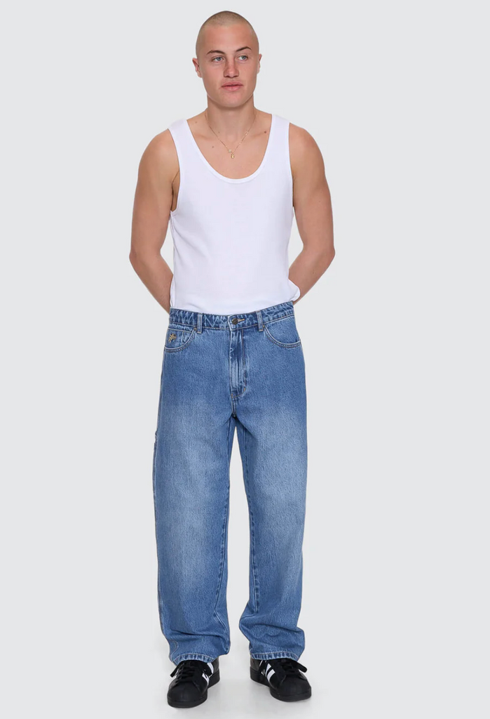Featuring workwear roots with an easy street fit, the Is This It Carpenter Jean in Faded Sky High is an everyday favourite. Cut from durable 14.2oz cotton denim, it features a relaxed, regular fit, with just enough room through the legs for all-day comfort. Carpenter styling keeps it functional, while an internal drawcord adds adjustable comfort for daily wear. Back pocket embroidery brings a subtle detail hit, finished in a light blue wash that works year-round. Easy to pair with tanks, oversized tees, or hoodies, these men's carpenter jeans are a wardrobe must-have.